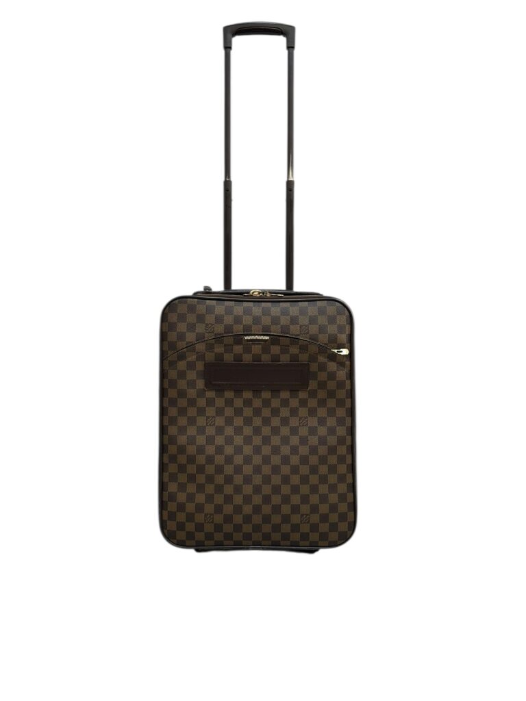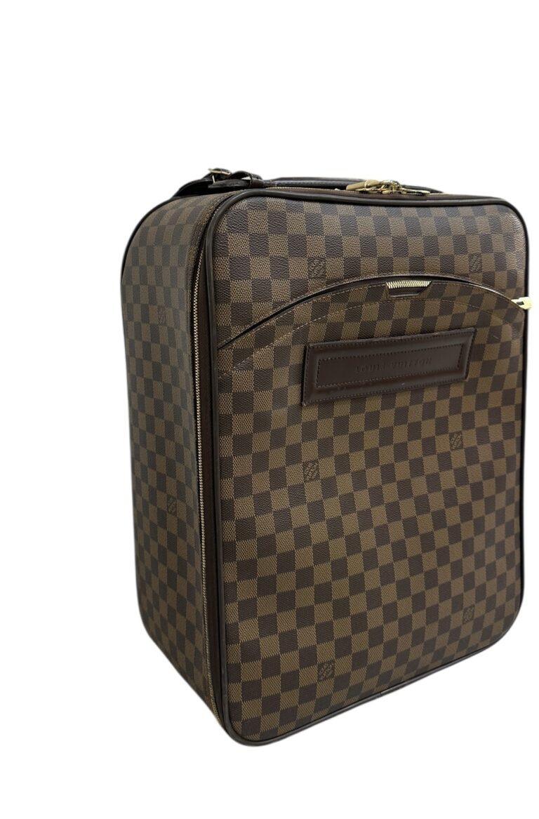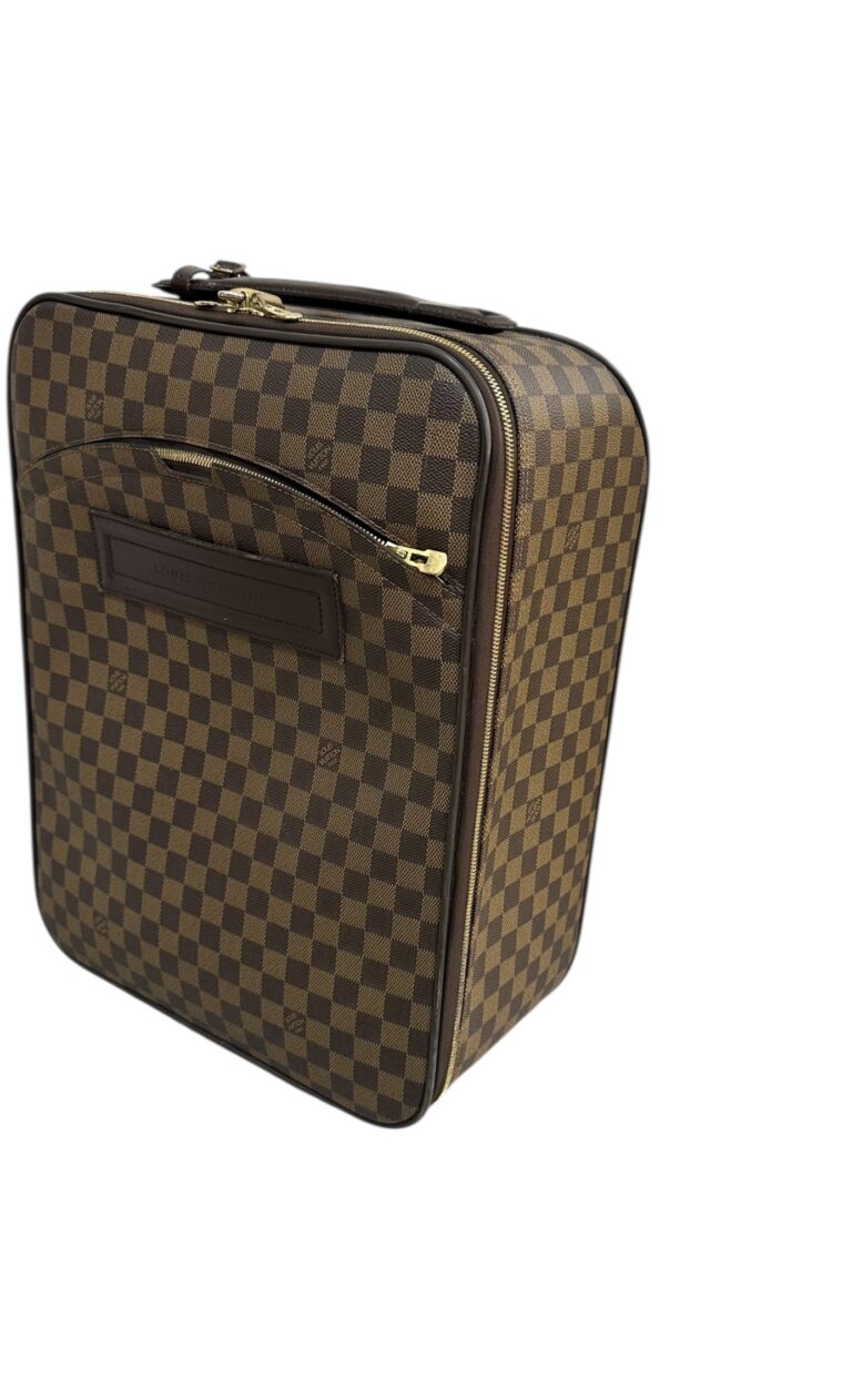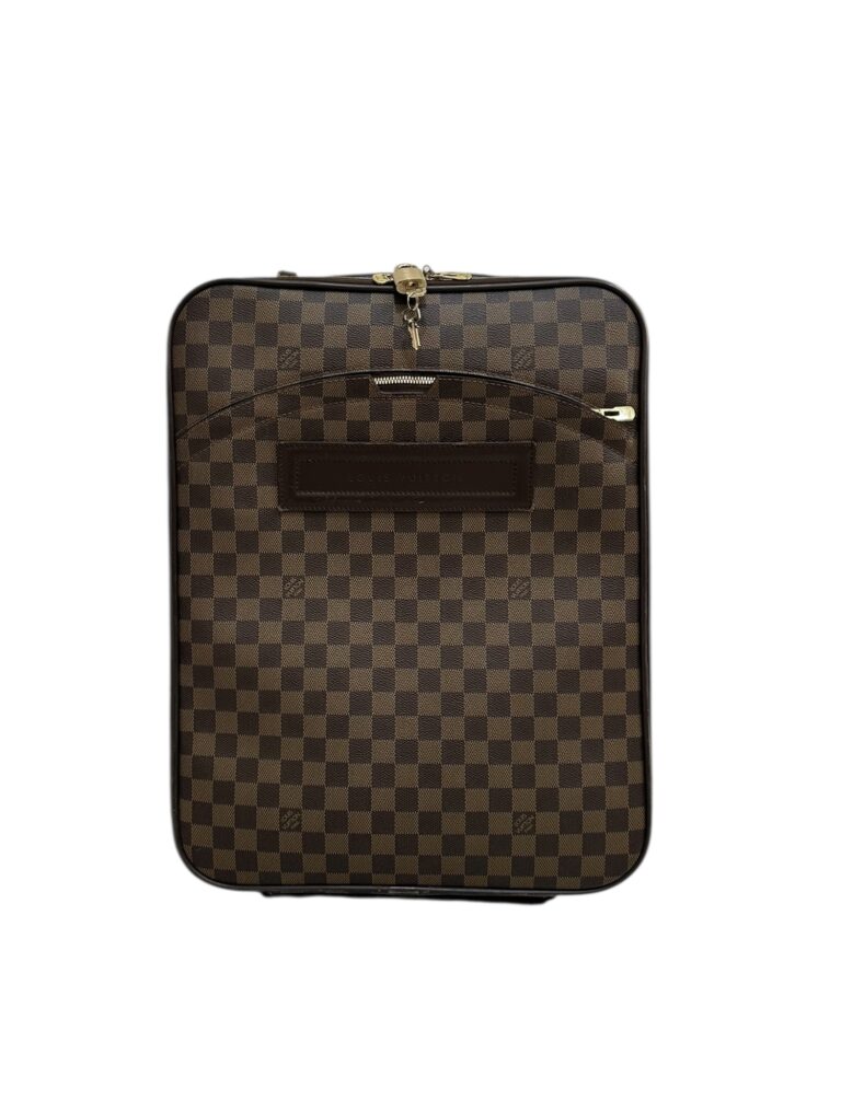 Mala em Canvas Damier Ébène com detalhes em couro calfskin marrom. Fechamento por cursor e cadeado. Parte interna com compartimento único dois bolsos grandes com zíper. Possui um bolso externo com zíper.