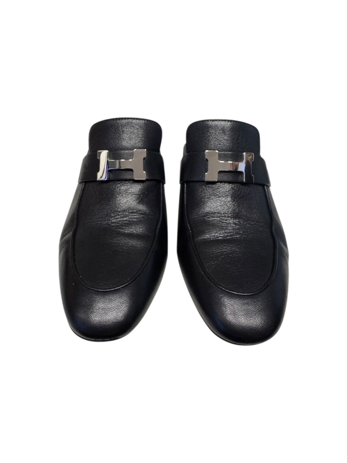 Mule Hermès Paradis confeccionada em couro, com design minimalista e acabamento refinado. Possui o icônico H da marca em tom prata, palmilha em couro para conforto e solado resistente. Sola 38,5 Eur / 36,5 BR.
