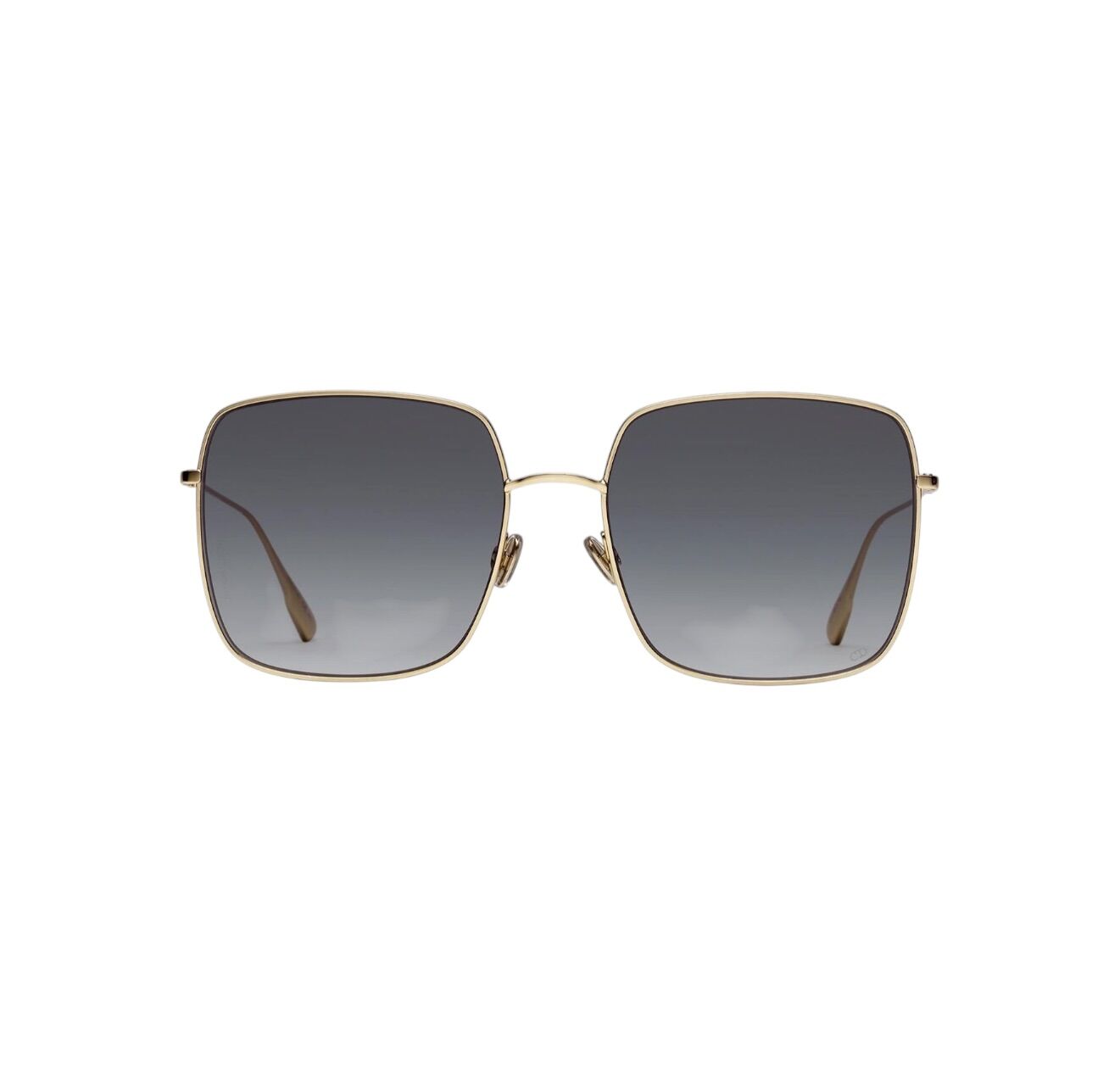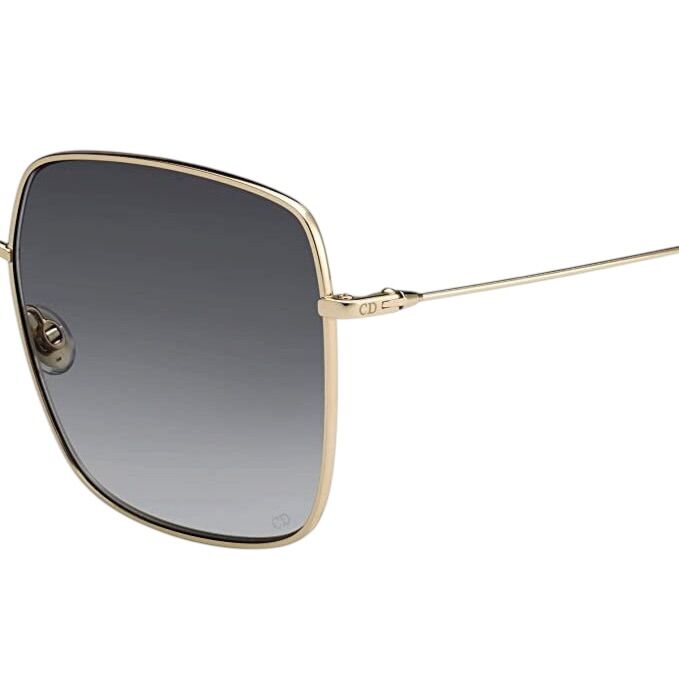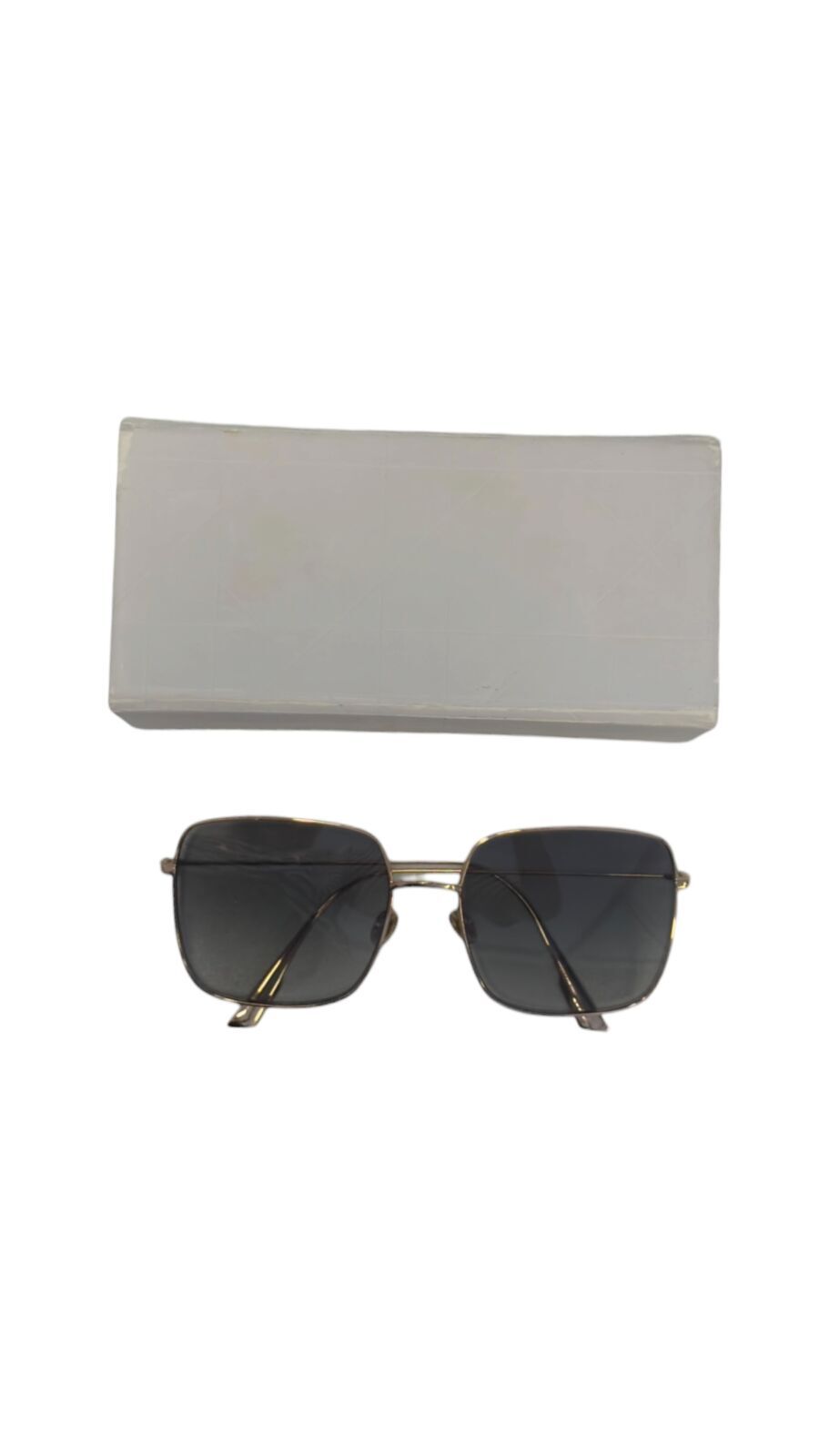 Óculos com armação e haste em metal dourado, lentes grandes quadradas na cor fumê. Sem marcas de uso, caixa está com algumas marcas.