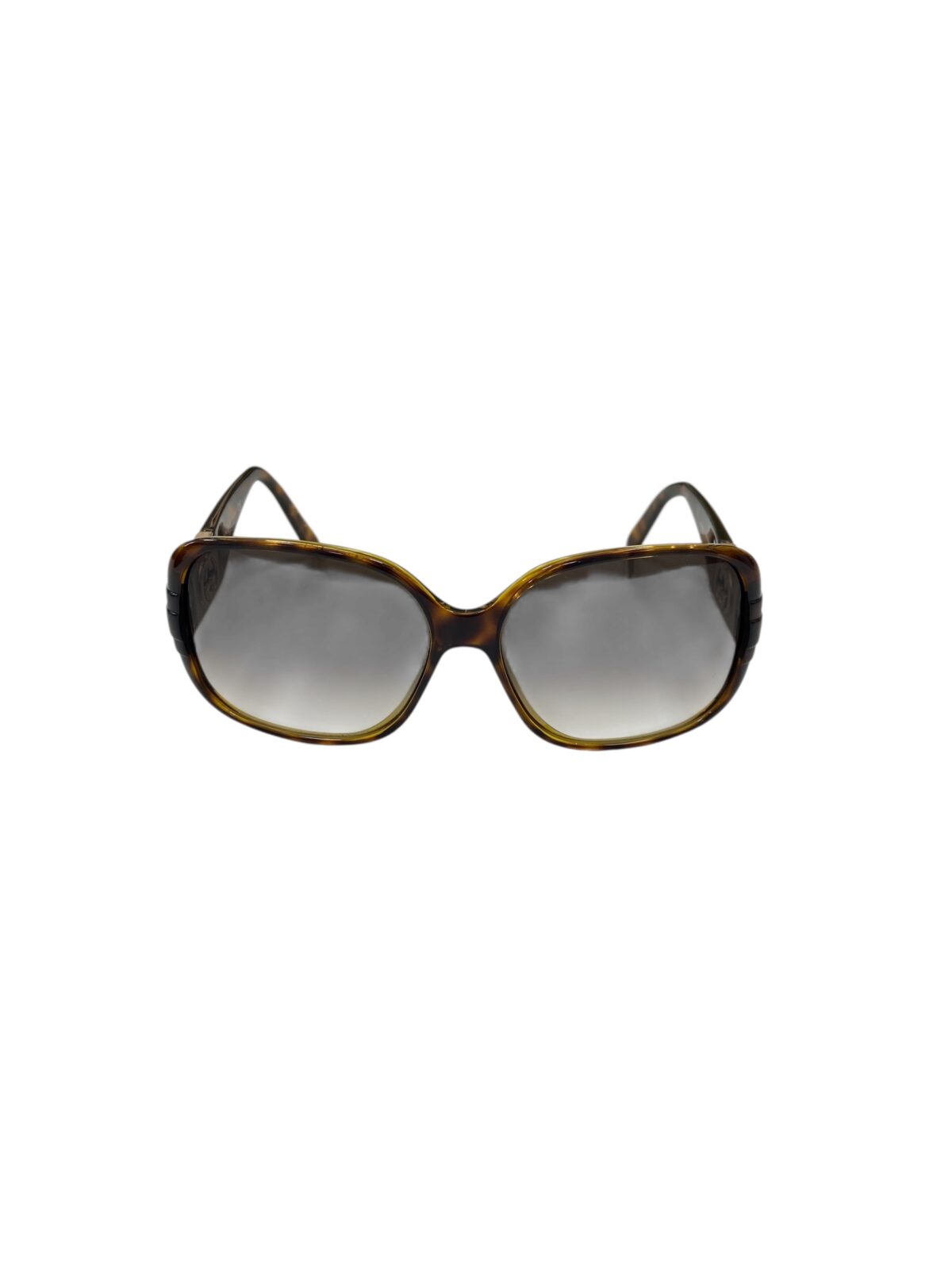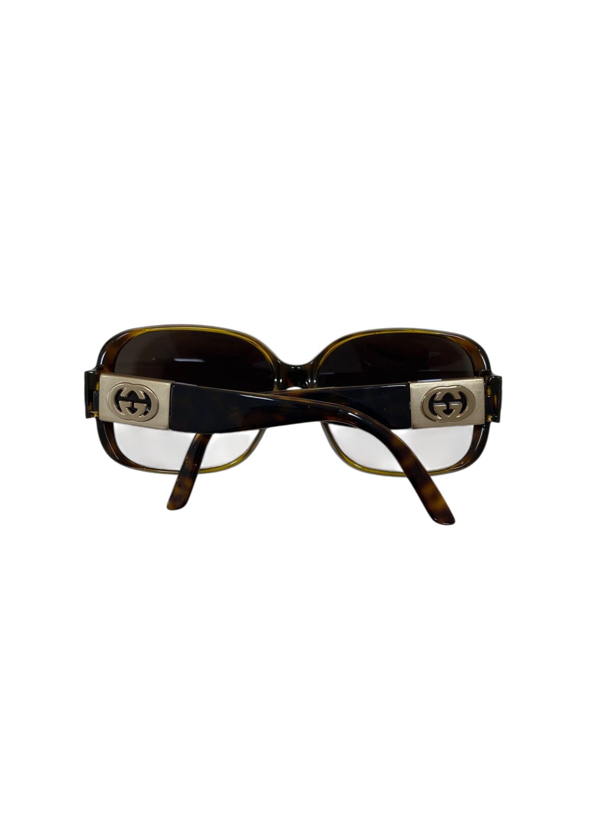 Óculos quadrado em acetato tartaruga, lentes marron degradê, possui logotipo da Gucci em dourado nas hastes, próximo à parte frontal.