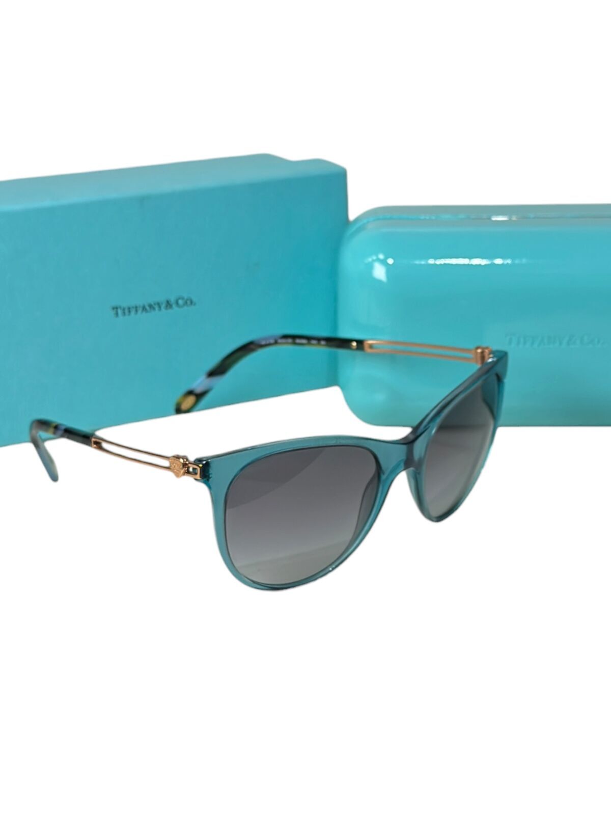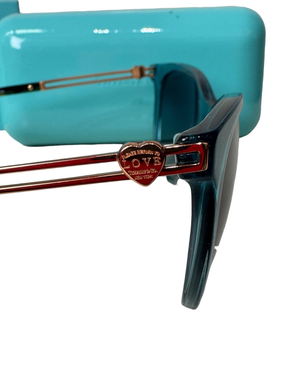 Óculos em acetato azul com lente cinza fumê, haste possui detalhe em metal na cor bronze com coração e acabamento em acetato em tons de azul, verde e amarelo.