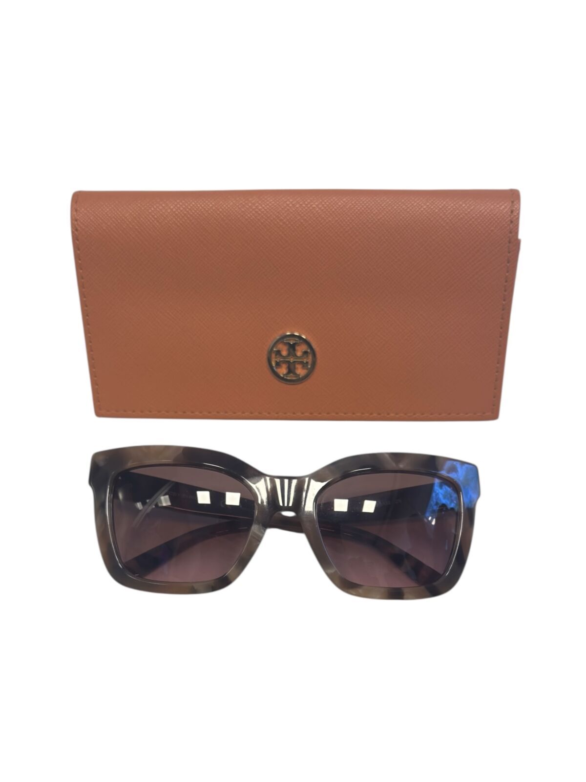 Óculos em acetato tartaruga marrom perolado e detalhes dourado nas laterais das hastes. Lente fumê. Com case.